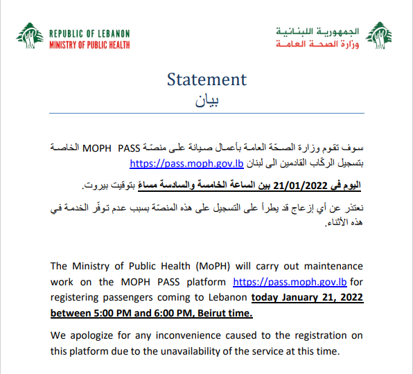 أعلنت وزارة الصحة العامة أنّها “سوف تقوم بأعمال صيانة على منصّة MOPHPASS الخاصة بتسجيل الركّاب القادمين الى لبنان اليوم في 21/01/2022 بين الساعة الخامسة والسادسة مساءً بتوقيت بيروت”.